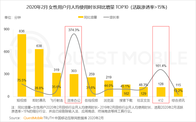 4、時長方面,女性用戶用于視頻、游戲等泛娛樂行業(yè)的時長增量較大,同時由于疫情影響,很多媽媽用戶不但要在家辦公還要陪娃上課,對效率辦公、K12行業(yè)的使用時長增幅巨大。
