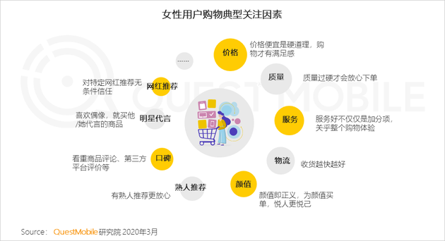 3、女性購物時,考慮的因素越來越多,除了價格、品質(zhì)等傳統(tǒng)購物因素,社交推薦、顏值、明星代言、網(wǎng)紅推薦都可能成為女性下單的理由。
