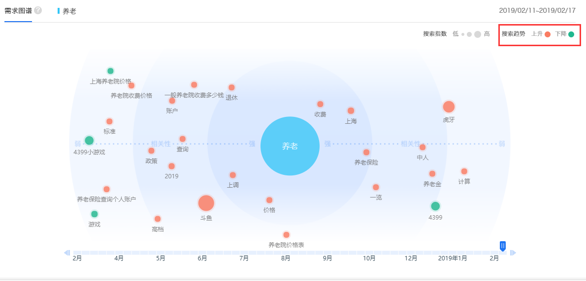 我們再來看一張圖,需求圖譜,這張可以看養(yǎng)老這個關(guān)鍵詞相關(guān)需求趨勢,這對你選取的方面具有一定的參考建議。