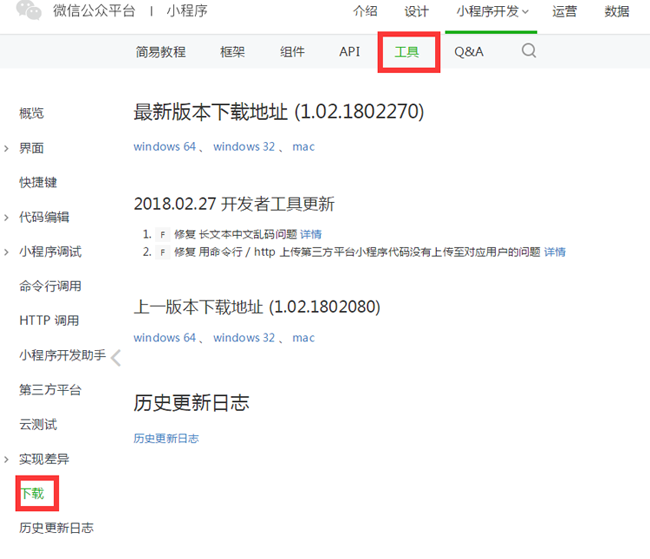 創(chuàng)新互聯(lián)小編了解,最近微信公眾平臺的小程序已經(jīng)出現(xiàn)了最新版本的開發(fā)工具,可以看到以下不同版本的系統(tǒng)更新下載 Windows 32 位、Windows 64 位和 Mac 這三個版本。可根據(jù)實際情況,選擇適合最新小程序開發(fā)工具來給自己開發(fā)。小程序開發(fā)工具最新版本下載地址是:https://mp.weixin.qq.com/debug/wxadoc/dev/devtools/download.html