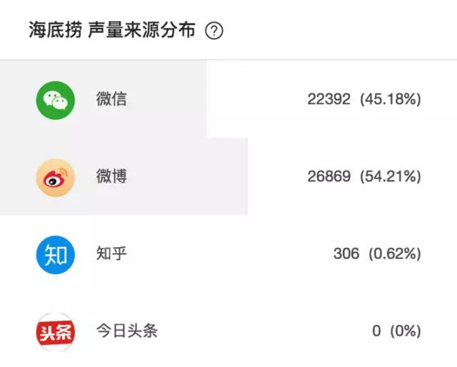 海底撈其實(shí)就傾向“口碑分享”的路線,它在微博上的聲量明顯高于微信公號上的,說明很大部分與“海底撈”有關(guān)的信息都是人們自發(fā)的分享,而不是故意為它寫一篇推文。