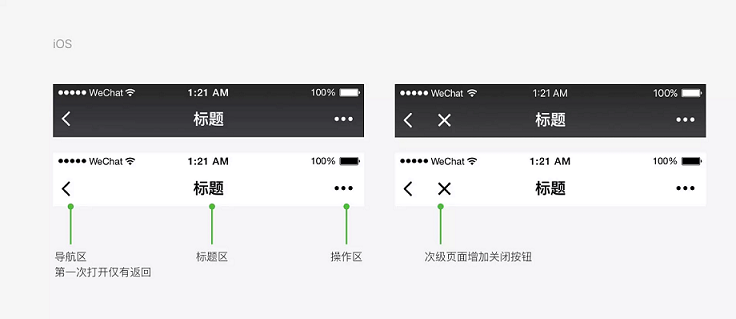 微信進入小程序的第一個頁面,導航區(qū)通常只有一個操作——“返回”,即返回進入小程序前的微信頁面。 進入小程序后的次級頁面,導航區(qū)的操作為——“返回” 和“關閉”。 “返回”,即返回上一級小程序界面或微信界面。“關閉”,即在當前界面直接退出小程序,回到進入小程序前的微信頁面。