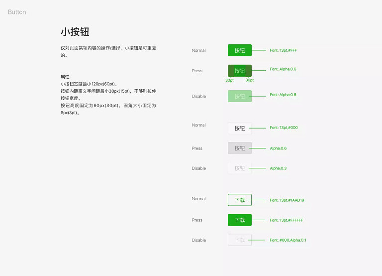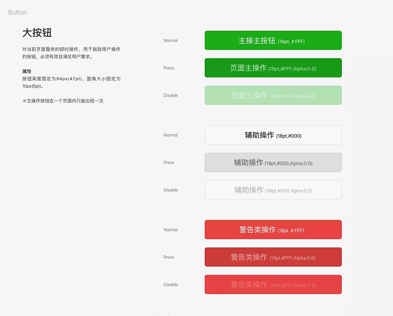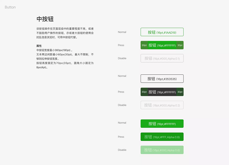 藍色為鏈接用色,綠色為完成字樣色,紅色為出錯用色 Press 與 Disable 狀態(tài)分別降低透明度為20%與10%。