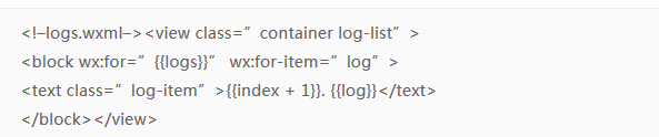 logs 頁面使用 <block/> 控制標簽來組織代碼,在 <block/> 上使用 wx:for 綁定 logs 數據,并將 logs 數據循環(huán)展開節(jié)點。