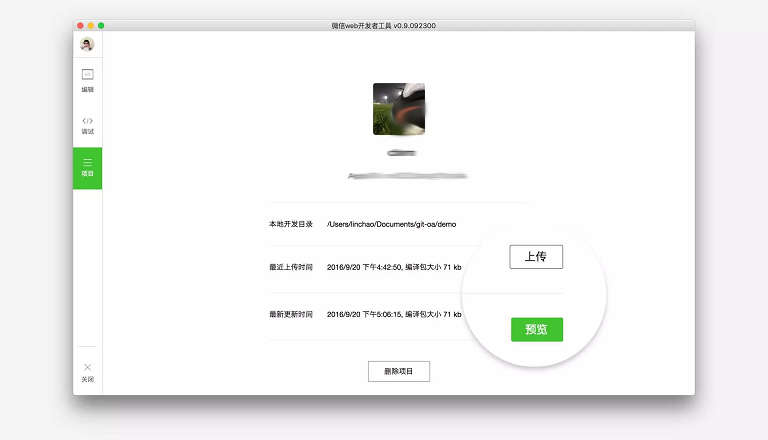 開發(fā)者工具左側菜單欄選擇”項目”,點擊”預覽”,掃碼后即可在微信客戶端中體驗。