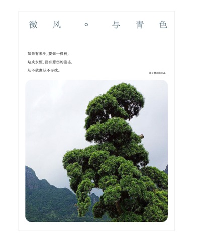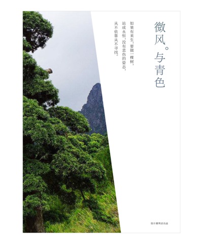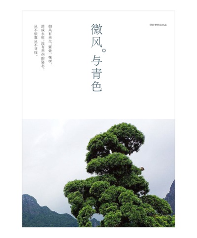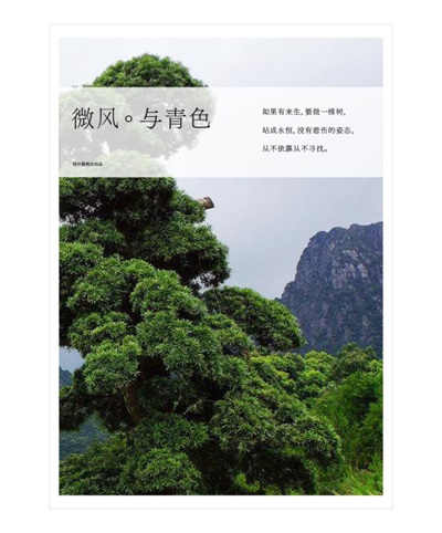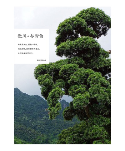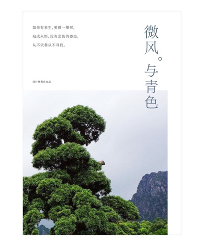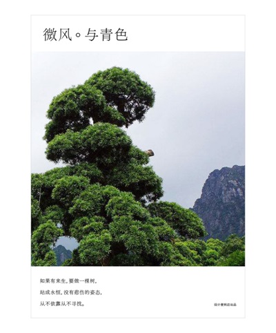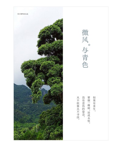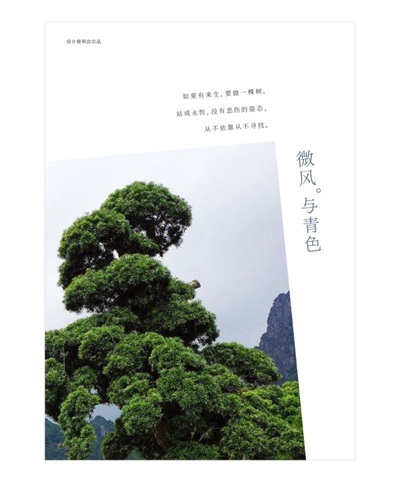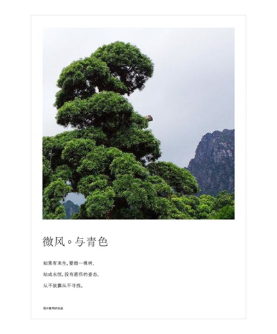 △ 將樹作為主體放在黃金分割的位置,對(duì)稱的地方安排文字區(qū)域,有視覺連貫性的作用。