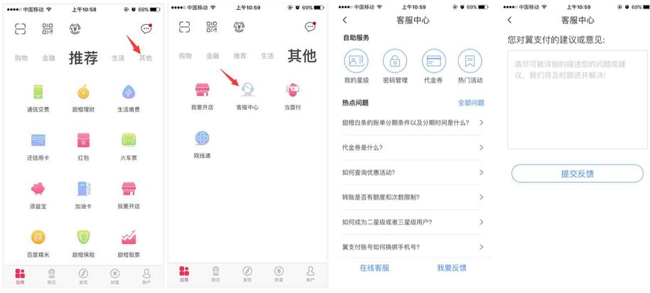 翼支付中該功能叫做我要反饋,入口有兩個(gè),如下: