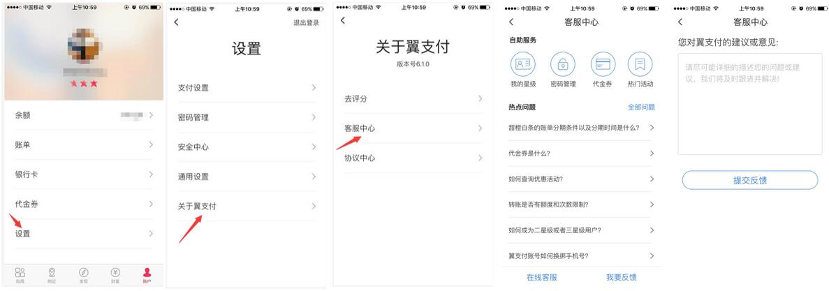 入口二:【賬戶-設(shè)置-關(guān)于翼支付-客服中心-我要反饋】