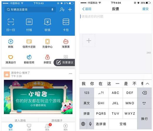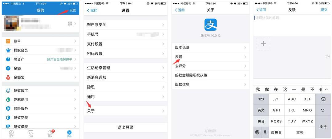 支付寶中該功能叫反饋,入口主要有兩個(gè),如下: