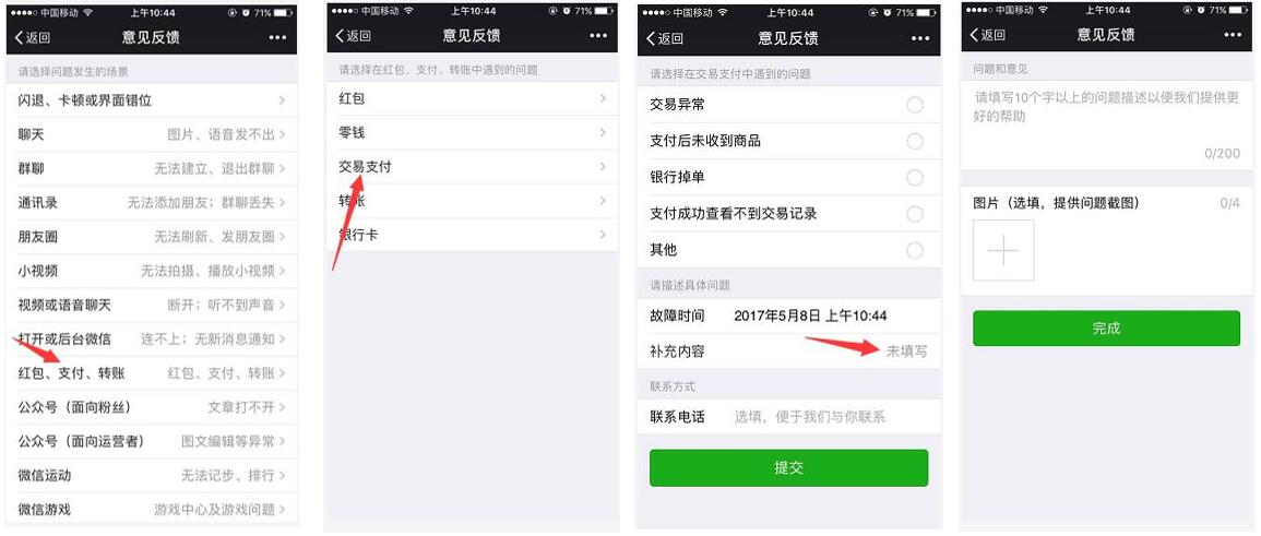 小明去便利商店消費(fèi),取得商品后掃碼支付,系統(tǒng)提示異常,無(wú)法完成支付,最后只能現(xiàn)金支付,小明很無(wú)奈,于是想向支付機(jī)構(gòu)反饋下自己的問(wèn)題,以下是三種支付類APP的意見(jiàn)反饋功能。
