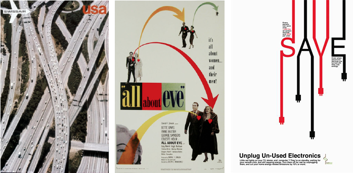如上面所示左圖是瑞士航空公司的海報設計,不同方向的蜿蜒的公路線條性感的交織在一起,使得畫面非常豐富。