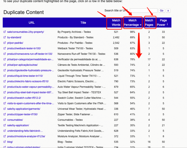 如果想查看到底是哪些頁面的內(nèi)容是重復(fù)的,可以查看具體的重復(fù)頁面。系統(tǒng)提供了頁面的重復(fù)字數(shù),重復(fù)度以及與之相匹配的頁面,我習(xí)慣上對重復(fù)度進行一個從上到下的排序,這樣就可以首先修改重復(fù)度比較高的頁面