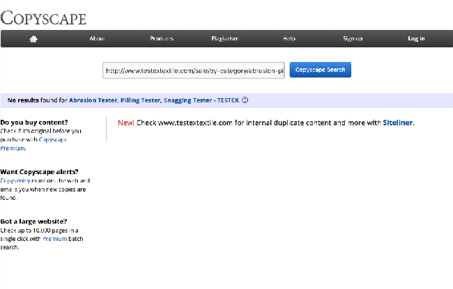 如圖所示,輸入域名,即可查看內(nèi)容是否有重復(fù)。需要注意的一點是,Copyscape只能是單個網(wǎng)頁去進行檢索,沒有辦法一次性完成整站檢測。