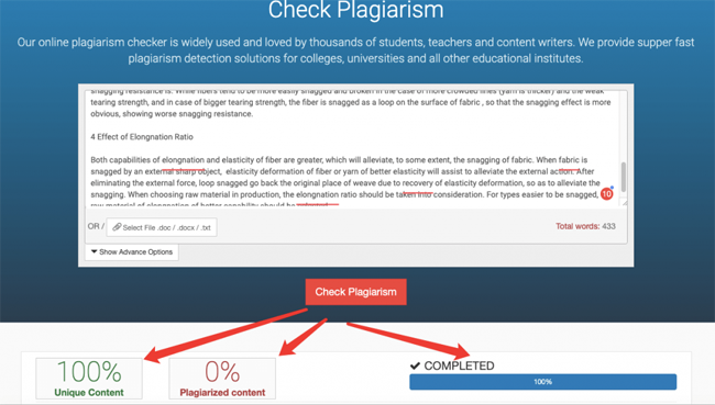 Check-plagiarism同樣支持文本檢測和網(wǎng)頁檢測。這個網(wǎng)站的界面就比較干凈整潔,使用起來很方便。直接輸入想要檢測的內(nèi)容,點擊Check Plagiarism, 系統(tǒng)便會顯示原創(chuàng)內(nèi)容(Unique Content)的比例和 重復(fù)內(nèi)容(Plagiarized Content)的比例