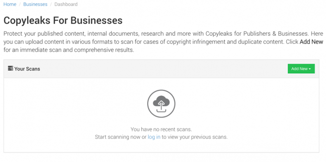 Copyleaks主要提供教育和商務(wù)領(lǐng)域的內(nèi)容原創(chuàng)度檢測功能,它是付費的,但提供30天的免費試用期。系統(tǒng)支持文件、網(wǎng)頁以及文本重復(fù)度檢測。