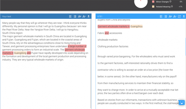 除此之外,我們可以看到每一個句子的內(nèi)容重復(fù)度檢測顯示,如果有重復(fù)的內(nèi)容還會顯示與之相重復(fù)的網(wǎng)頁。
