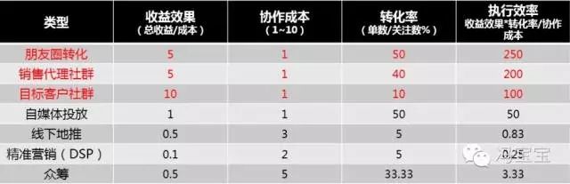 表中我們可以明顯的看出社群營銷在收益效果、協(xié)作成本(對其他工作的依賴程度)、轉(zhuǎn)化率、執(zhí)行效率都遠(yuǎn)遠(yuǎn)優(yōu)于其他渠道。