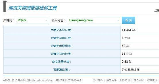 我們可以通過(guò)上圖可以看到盧松松博客的盧松松該詞的關(guān)鍵詞密度分別為0.83%和1.2%,雖然兩者平臺(tái)計(jì)算的關(guān)鍵詞密度不一,大的不同點(diǎn)其實(shí)是不同平臺(tái)對(duì)于關(guān)鍵詞的字符處理方式不一樣。不管是愛(ài)站還是站長(zhǎng)工具不會(huì)直接進(jìn)行頁(yè)面關(guān)鍵詞密度計(jì)算,而是先通過(guò)網(wǎng)頁(yè)去除所有html元素代碼以后所得到的網(wǎng)頁(yè)總字符進(jìn)行計(jì)算。