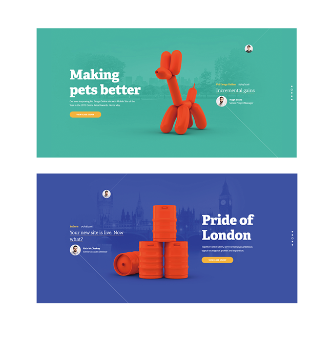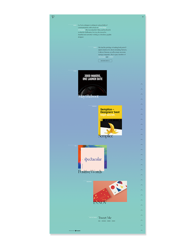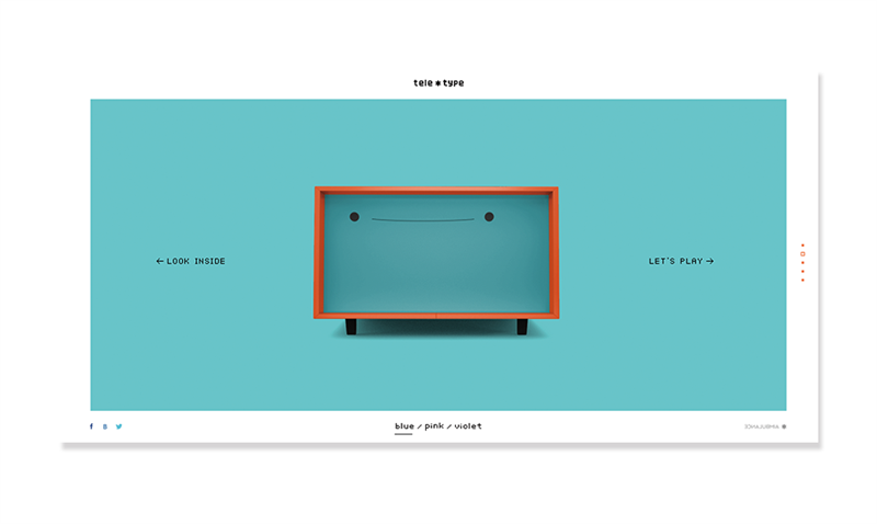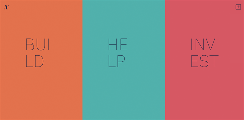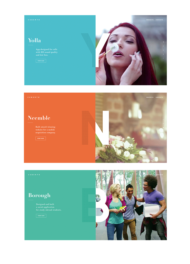 我們從一個屏幕的視覺出發(fā),而非從全局來看,一個屏幕運用一個單色進行搭配,是行之有效的極簡風格配色法。它很好的解決了色彩單一的問題,與此同時,整個網(wǎng)頁依然保有豐富多彩的色彩印象。這類配色技巧在許多展示類的網(wǎng)頁中常見。