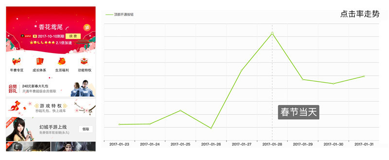 臨近農(nóng)歷春節(jié),設(shè)計(jì)師為所在業(yè)務(wù)設(shè)計(jì)了一套春節(jié)氛圍,并在除夕前幾天發(fā)布上線。節(jié)后觀察數(shù)據(jù),發(fā)現(xiàn)春節(jié)期間頁面頂部續(xù)費(fèi)按鈕點(diǎn)擊率波動(dòng)上升,相較春節(jié)前提升幅度很大: