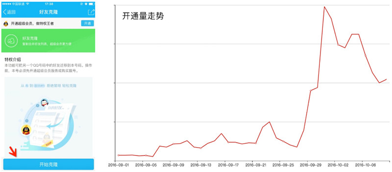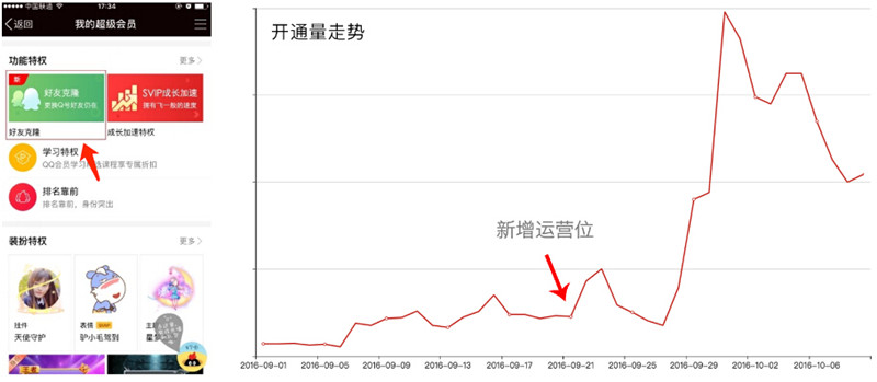 舉個(gè)例子,為了縮短操作路徑,產(chǎn)品經(jīng)理與設(shè)計(jì)師溝通在「好友克隆」的詳情頁里增加了一個(gè)底部按鈕,方便用戶直接在手機(jī)中實(shí)現(xiàn)克隆好友的操作,好友克隆是會(huì)員特權(quán),可以觀察其帶動(dòng)的會(huì)員開通來檢驗(yàn)設(shè)計(jì)提升效果,發(fā)布后新增會(huì)員數(shù)量走勢(shì)如下: