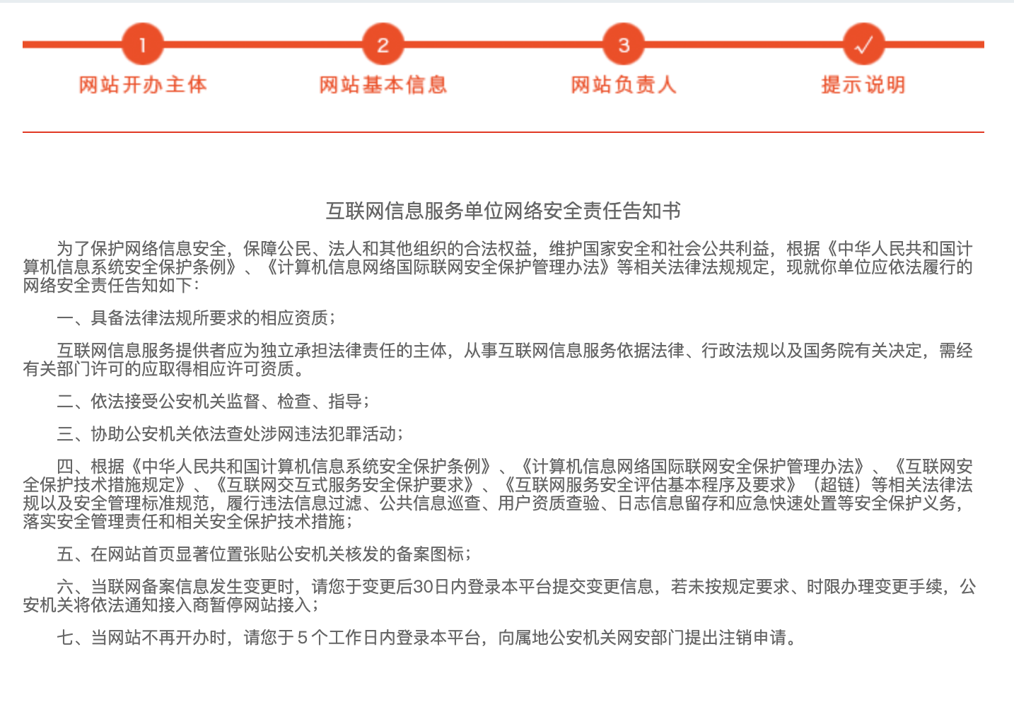 六、當(dāng)聯(lián)網(wǎng)備案信息發(fā)生變更時(shí),請(qǐng)您于變更后30日內(nèi)登錄本平臺(tái)提交變更信息,若未按規(guī)定要求、時(shí)限辦理變更手續(xù),公安機(jī)關(guān)將依法通知接入商暫停網(wǎng)站接入;