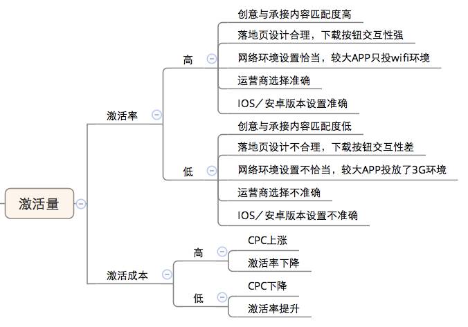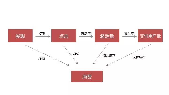 這里我們的激活定義為用戶下載APP后在聯(lián)網(wǎng)的狀態(tài)下打開APP,激活量即為激活A(yù)PP的用戶數(shù)量。激活的部分我們引出兩個概念,激活成本(消費(fèi)/激活量)和激活率(激活量/點(diǎn)擊量)。
