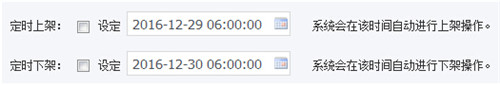 設(shè)置完商品基本信息之后,設(shè)置上下架時(shí)間,亦可直接上架發(fā)布。和商品相關(guān)的活動(dòng),一旦商品下架,活動(dòng)將失效,無(wú)法購(gòu)買。搜索、篩選的商品范圍都是在上架的商品范圍進(jìn)行。