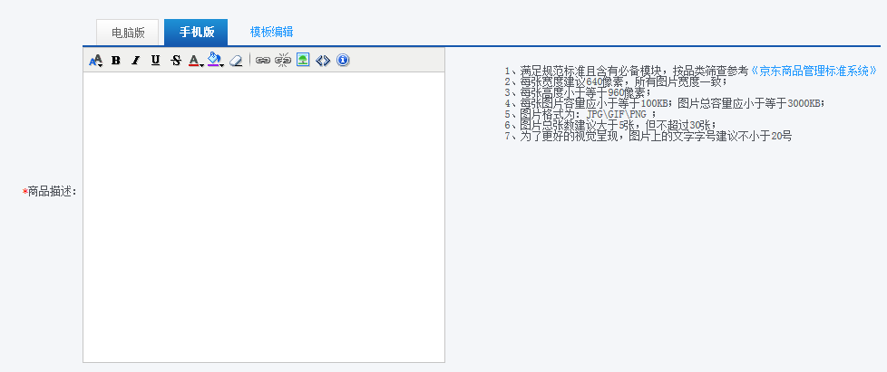 商品詳情頁(yè)現(xiàn)在一般會(huì)區(qū)分電腦版和手機(jī)版,由于兩者的使用場(chǎng)景和設(shè)備不同,側(cè)重點(diǎn)也不相同。為了更好的展示產(chǎn)品特點(diǎn),可提供不同的產(chǎn)品詳情模板,亦可支持不同的富文本編輯。