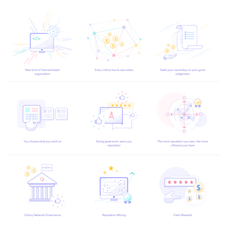 設(shè)計(jì)師們拿出了不同風(fēng)格的插畫,它們在主題上和整個(gè)UI保持一致,營造出友好、平易近人的氛圍,同時(shí)也讓人對整個(gè)公司形象產(chǎn)生足夠的好感。插畫中展示出 Colony 是如何幫助世界各地的用戶溝通、交流、達(dá)成目標(biāo)的。