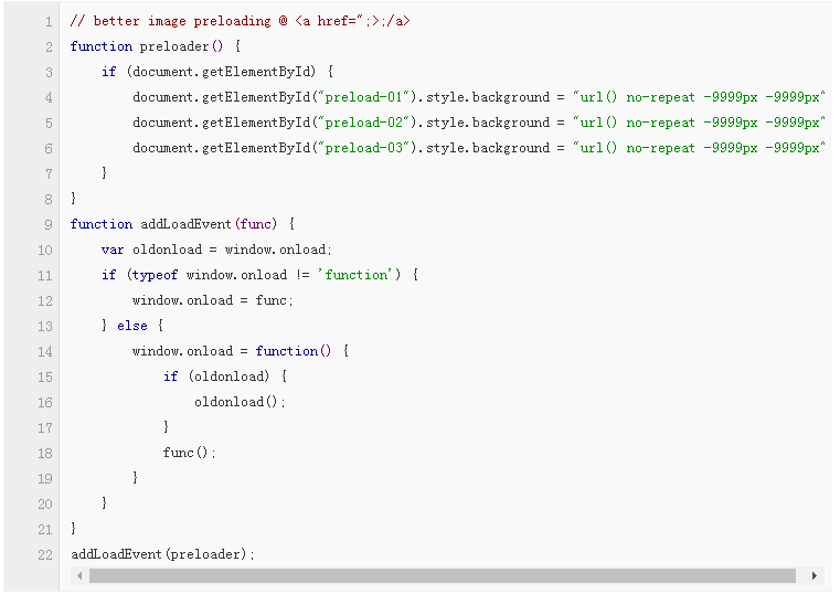 我們又對該方法進(jìn)行了改進(jìn)。將該腳本封裝入一個函數(shù)中,并使用 addLoadEvent(),延遲預(yù)加載時間,直到頁面加載完畢。