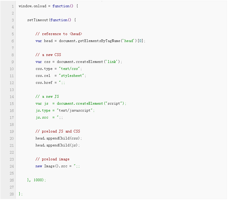 該方法雖然高效,但仍有改進(jìn)余地。使用該法加載的圖片會同頁面的其他內(nèi)容一起加載,增加了頁面的整體加載時間。為了解決這個問題,我們增加了一些JavaScript代碼,來推遲預(yù)加載的時間,直到頁面加載完畢。代碼如下: