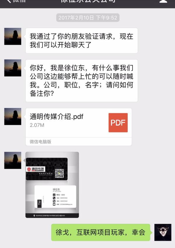 兩個(gè)陌生人在線下見面的時(shí)候,互相介紹環(huán)節(jié)往往有交換名片的環(huán)節(jié)。而在線上的話,細(xì)心點(diǎn)的加微信好友后會(huì)發(fā)個(gè)電子版的名片或者是一段自我介紹,如圖——