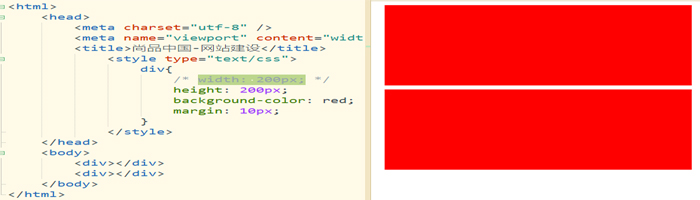 試著再添加一個div標簽,加入margin-bottom下邊距,區(qū)分他們的位置,接下來把寬度去掉,可以看到寬度變寬了,從瀏覽器的左邊到右邊,現(xiàn)在有兩個紅色塊逐行顯示仿佛表現(xiàn)的很霸道,如下圖:
