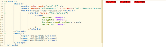 用span標簽為例,添加三個span標簽,設置”寬高200px 背景顏色紅色 margin10px“樣式, 發(fā)現(xiàn)并沒有按200*200去展示 ,margin標簽對上下并沒有改變,對比塊元素由此得知: