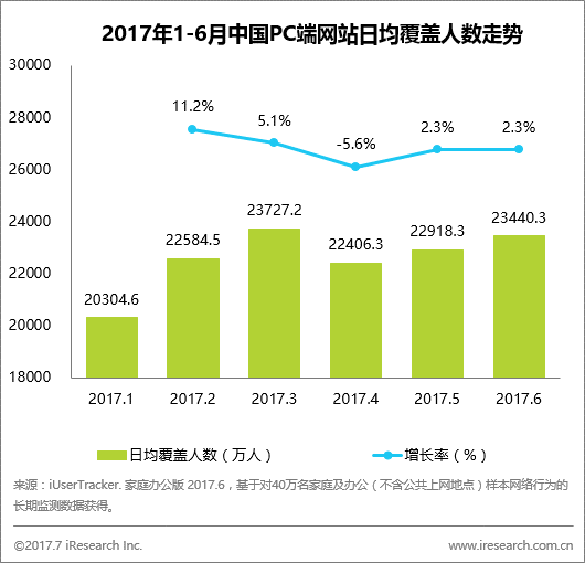 PC端網(wǎng)站上半年日均覆蓋人數(shù)穩(wěn)中有升,與月度覆蓋人數(shù)走勢相比,上升趨勢更加明顯。具體看來,2017年2月PC端網(wǎng)站日均覆蓋人數(shù)增幅最為明顯,達(dá)11.2%,5月與6月份增幅則穩(wěn)定在2.3%左右,有所回落。艾瑞分析認(rèn)為,綜合來看,PC端網(wǎng)站用戶活躍度有所增強,使用頻次有小幅增加,網(wǎng)民對PC端網(wǎng)站需求依然旺盛,不可忽視。