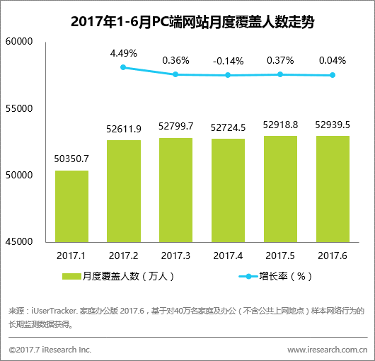 PC端網(wǎng)站覆蓋人數(shù)在2017年1月-6月間總體保持穩(wěn)定,僅在1月至2月間受年節(jié)影響小幅上漲4.49%,增幅約2000萬人,總?cè)藬?shù)保持在5.2億人上下。艾瑞分析認(rèn)為,在PC端網(wǎng)站月度覆蓋人數(shù)長期趨穩(wěn)的態(tài)勢下,節(jié)假日等短期因素對網(wǎng)民PC使用行為的影響可能會愈加明顯。