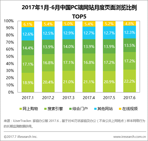 然而從月度頁面瀏覽比例上看,在線視頻占比相對較少,且仍在持續(xù)走低。網(wǎng)上購物則在此項中占比第一,保持著小幅穩(wěn)定增長態(tài)勢。艾瑞分析認(rèn)為,隨著電商網(wǎng)站的內(nèi)容化趨勢和各種營銷活動的頻頻舉辦,用戶不再是一種“買完即走”消費模式,多樣的優(yōu)質(zhì)內(nèi)容和促銷信息對于用戶產(chǎn)生了更大的吸引力,用戶較之前會在電商網(wǎng)站瀏覽更多頁面,找尋和消費更多感興趣的內(nèi)容。
