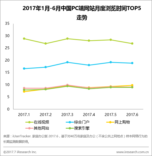 在月度瀏覽時間方面,在線視頻憑借自身特性依舊一個身位。據(jù)艾瑞PC指數(shù)顯示,在線視頻2017年1月至6月月度瀏覽時間長期穩(wěn)定在28億小時上下,較第二名綜合門戶高出近10億小時。網(wǎng)上購物和搜索引擎分列第三、第五位,無緣十億級門檻,但仍在持續(xù)小幅增長。