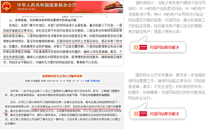 c) 每天病毒、木馬安全掃描,并且通過短信、郵件及時提醒網(wǎng)站,協(xié)助網(wǎng)站第一時間發(fā)現(xiàn)并解決網(wǎng)站的安全問題。申請“可信網(wǎng)站”驗(yàn)證需要有什么資質(zhì)要求?申請“可信網(wǎng)站”驗(yàn)證的用戶為擁有工商營業(yè)執(zhí)照的企業(yè)或擁有組織機(jī)構(gòu)代碼證的機(jī)關(guān)、事業(yè)單位、社團(tuán)、組織等。”可信網(wǎng)站”驗(yàn)證暫不對個人及境外機(jī)構(gòu)開放。“可信網(wǎng)站”驗(yàn)證的價值是什么?a) 對于中小企業(yè):證明企業(yè)的身份,幫助企業(yè)贏得用戶的信任,提升互聯(lián)網(wǎng)營銷效果,提高網(wǎng) 站訂單轉(zhuǎn)化率,使企業(yè)網(wǎng)站的陌生訪客轉(zhuǎn)化為生意伙伴。b) 對于知名網(wǎng)站:防范假冒網(wǎng)站和釣魚網(wǎng)站,維護(hù)網(wǎng)站形象,保護(hù)網(wǎng)站用戶合法利益。