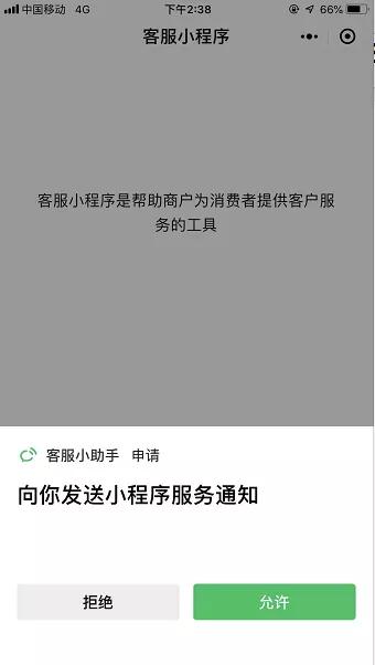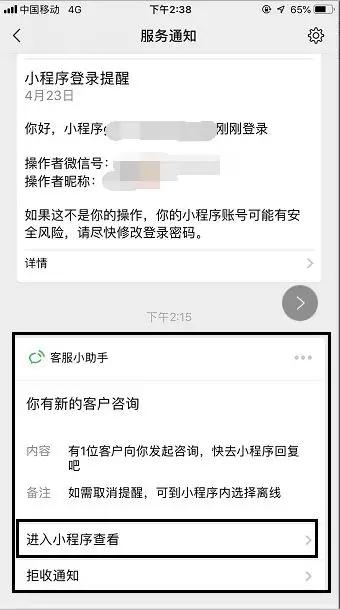發(fā)布小程序后,客戶在小程序中用客服助手對我們進行對話時,在微信中會有一條關于“客服小程序”通知,點擊進入查看即可進行對話