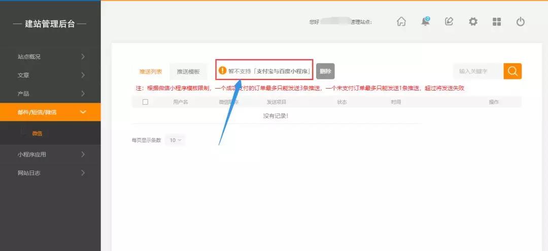 在建站后臺,將微信模板頁中的“僅支持微信小程序”改為“暫不支持支付寶與百度小程序”