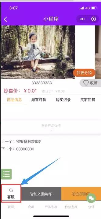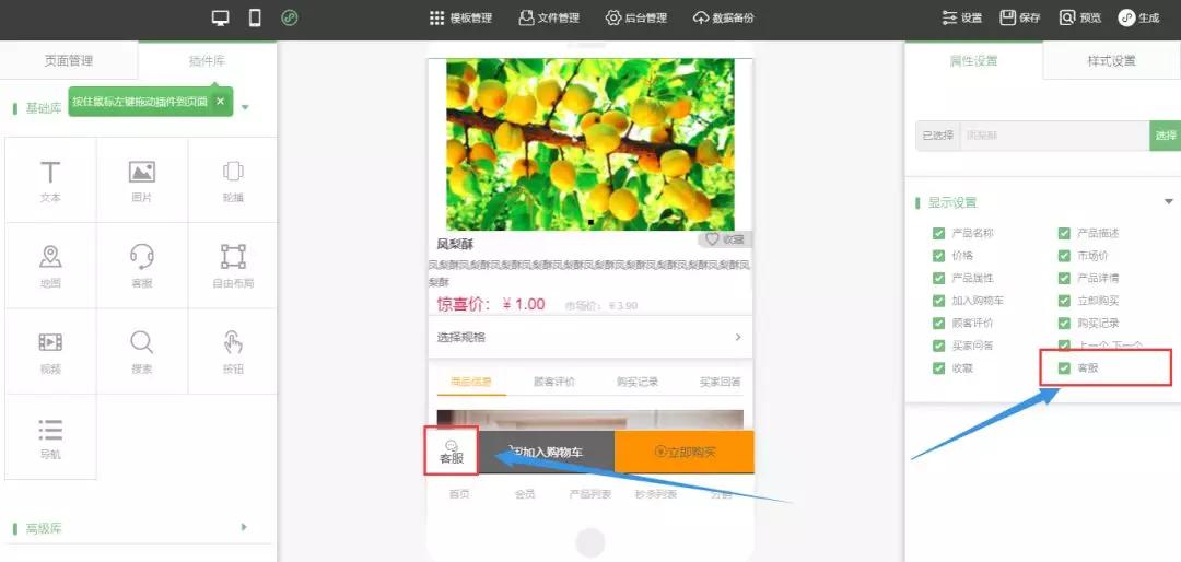 在編輯器中拖入產品詳情插件,在屬性設置中勾選“客服”,在頁面右下方則會有客服入口,和客服插件一樣可以使用微信的客服助手