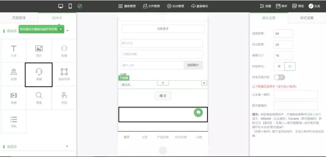 然后在建站小程序編輯器中,拖入“客服”插件,點擊保存并生成代碼