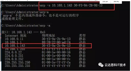 輸入字符串命令“arp -s 10.168.1.1 34-F3-9A-2B-9E-13“,即可綁定。