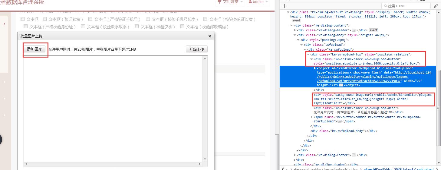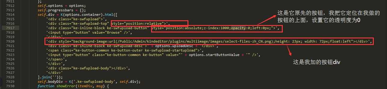在他的kindeditor-all.js文件中,對上傳圖片的objcet標簽的父標簽的div設(shè)置了絕對定位,又重新做了一個按鈕的div,把object標簽的父標簽div定位到我新做的按鈕div上,設(shè)置object標簽的父標簽div的透明度opacity:0,如下圖