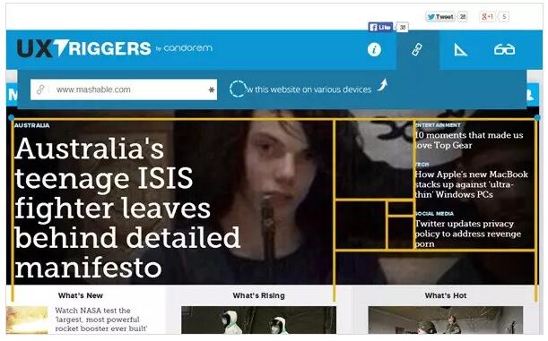 Mashable是一個新聞網(wǎng)站,我們用黃線標示了黃金比例的布局,可以看出網(wǎng)站內(nèi)容布局靈活,給予了信息排版喘息的空間。而以內(nèi)容為驅(qū)動的類似網(wǎng)站,大多使用傳統(tǒng)的網(wǎng)格布局,內(nèi)容密集而無重點,可以看出Mashable的黃金比例非常有效,即使是無形的。