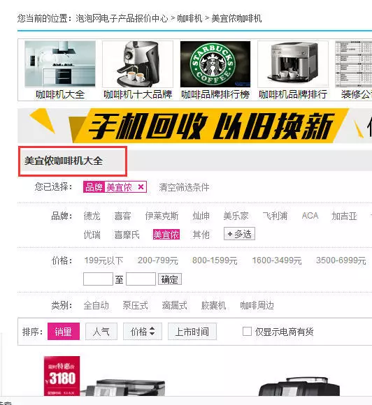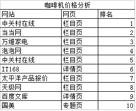 通過排名頁(yè)面類型的分析,以及通過關(guān)鍵詞的共性分析,價(jià)格類的關(guān)鍵詞,排名前10的站點(diǎn)頁(yè)面類型更偏向于是使用欄目頁(yè)面類型。如,咖啡機(jī)價(jià)格,排名前10的分別是一些商城的欄目頁(yè)。