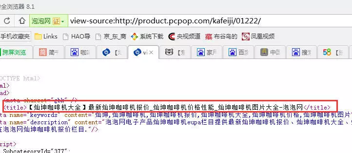 確定好著陸頁(yè)后,如果是個(gè)大型的網(wǎng)站,那么一般是由產(chǎn)品經(jīng)理確定原型圖(即著陸頁(yè)形態(tài)),然后SEO輸出需求文檔。那么,在確定好的頁(yè)面上,如何進(jìn)行頁(yè)面關(guān)鍵詞布局呢?以泡泡網(wǎng)-咖啡機(jī)價(jià)格欄目頁(yè)為例來說明:http://product.pcpop.com/kafeiji/01222/ 打開此頁(yè)面,并進(jìn)行右鍵—>源代碼查看。以下這幾個(gè)重點(diǎn)標(biāo)簽一定要布局上關(guān)鍵詞。