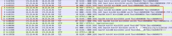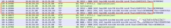 如下圖,這是使用 Wireshark 分析包內(nèi)容的展示,紅框內(nèi)是一個完整的 POST 請求處理過程,看 130 序號和 149 序號之間相差 40ms(0.1859 - 0.1448 = 0.0411s = 41ms),這個就是 Nagle 與 Delayed ACK 一起發(fā)送的化學(xué)反應(yīng),其中 10.48.159.165 運行的是 Delayed ACK,10.22.29.180 運行的是 Nagle 算法。10.22.29.180 在等 ACK,而 10.48.159.165 觸發(fā)了 Delayed ACK,這樣傻傻等了 40ms。
